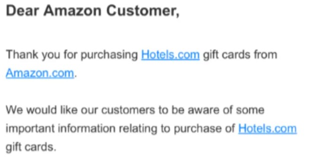 “Thank you for purchasing Hotels.com gift cards from Amazon.com,” reads the email sent to Amazon customers.