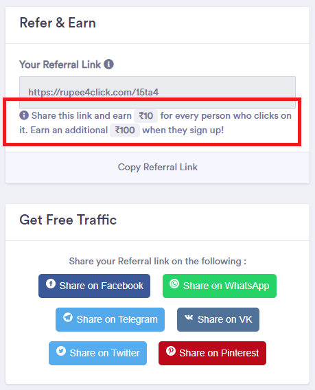The main way to earn money on the platform is by inviting others to join. According to the website, users can earn ₹10 for every click on their referral link and ₹100 for every person who signs up through the link.