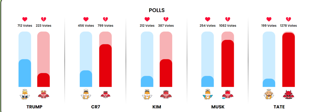 Love Hate INU will introduce a program in which a number of trending topics and personalities will turn into memes dressed as angels or devils. Then they will create a survey out of it, you have to vote on those topics or personalities using angel or devil icons in their platform, which depicts like or dislike in a different way.